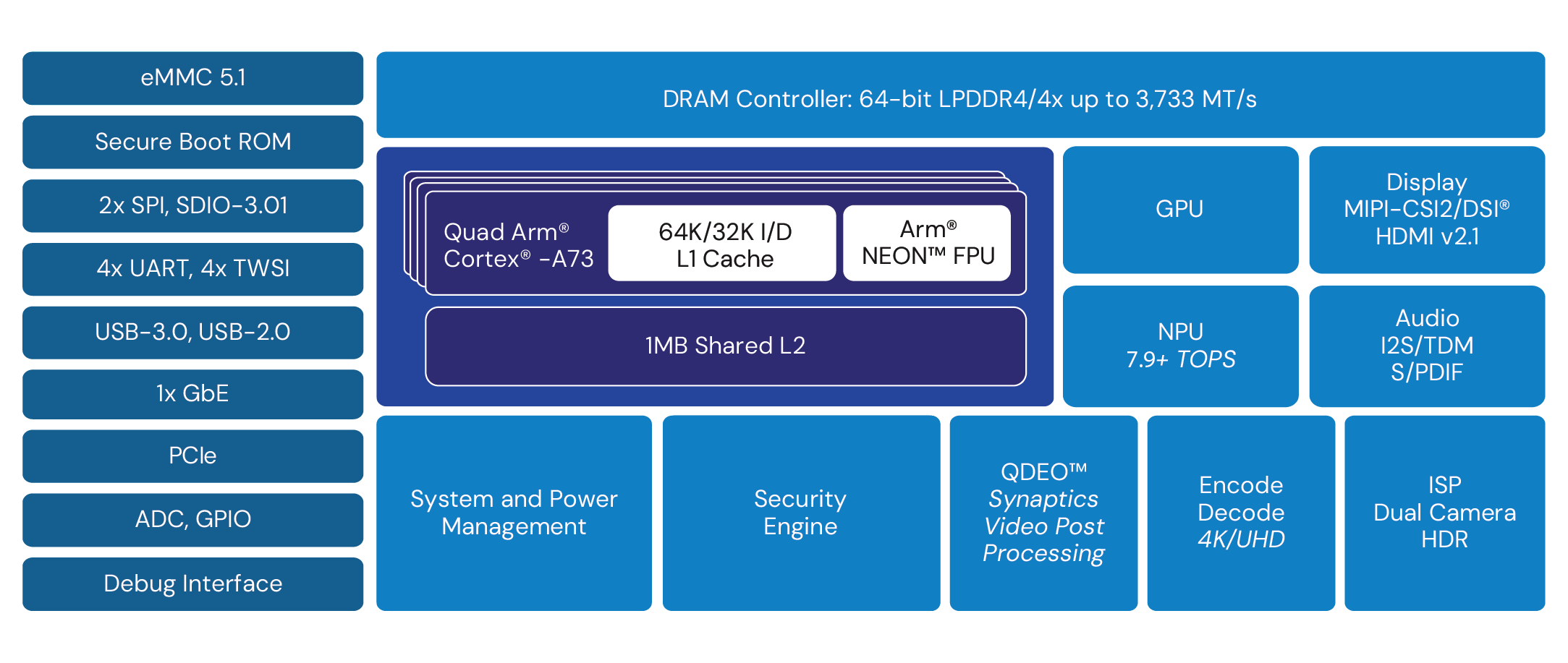 - GbE networking, PCIe, eMMC 5.1, SPI, SDIO, UART, USB, GPIO, ADCs