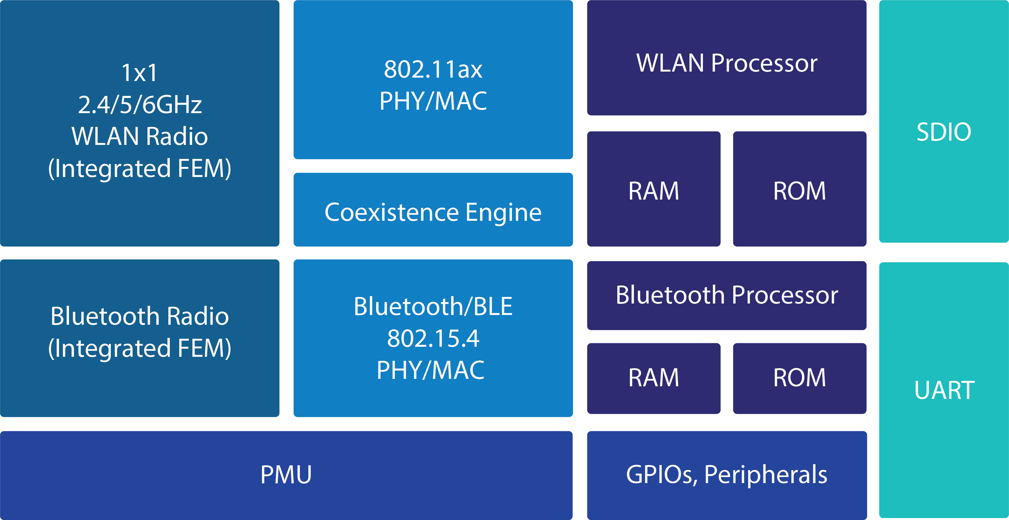 - Single-chip solution with support for IEEE 802.11 a/b/g/n/ac/ax, Bluetooth Classic, BLE, and IEEE 802.15.4 (Thread/Zigbee)